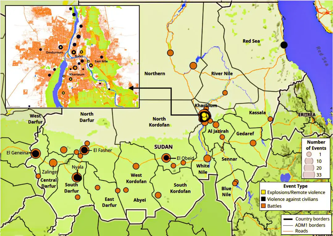 The conflict in Sudan has been centered in urban areas, as shown in this map locating incidents of violence from April 15 to May 19, 2023.
