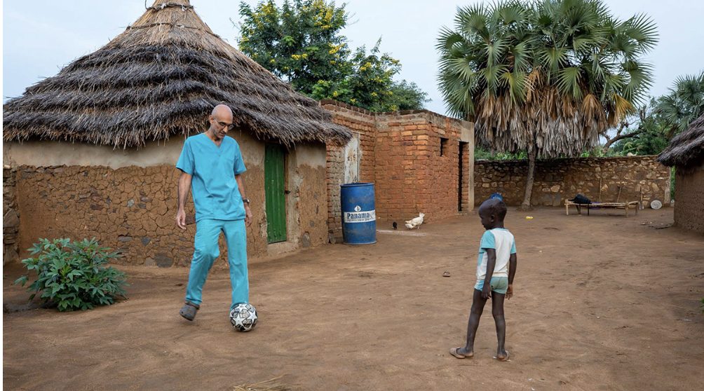 Dr. Tom Catena playing soccer with a child in Sudan. Catena has served as a medical missionary in Africa for more than 25 years, the last 17 at Mother of Mercy, a Catholic hospital located in Gidel in southern Sudan. Mother of Mercy Hospital was founded by Comboni Bishop Macram Gassis.